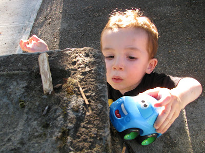 Theo is embarking on another significant developmental stage, learning words such as "mine" and "share" (the second one I'm especially proud of). He is also beginning to link words with increasing frequency. He has said "Myr wa" which means, "Myrtle is drinking water", and just the other evening "ball mine". I'd been modeling sharing for months, and recently he actually started using the word when offering me food. The best example, though, was the other morning. Theo was playing with his cars in the bathroom while I took my shower. I turned the water off and opened the curtain, and Theo looked at me and said "done!" I told him he was right and asked him if he would hand me my towel. He methodically emptied each hand of its car and grabbed my towel with both hands, turned around, and lifting it up to me said happily, "share!" It is the development of these concepts that fascinates me so. For instance, to Theo, "mine" means more than just a possession of an object, the uses it to mean "my way"! When he doesn't get what he wants he sometimes cries "mine mine mine".